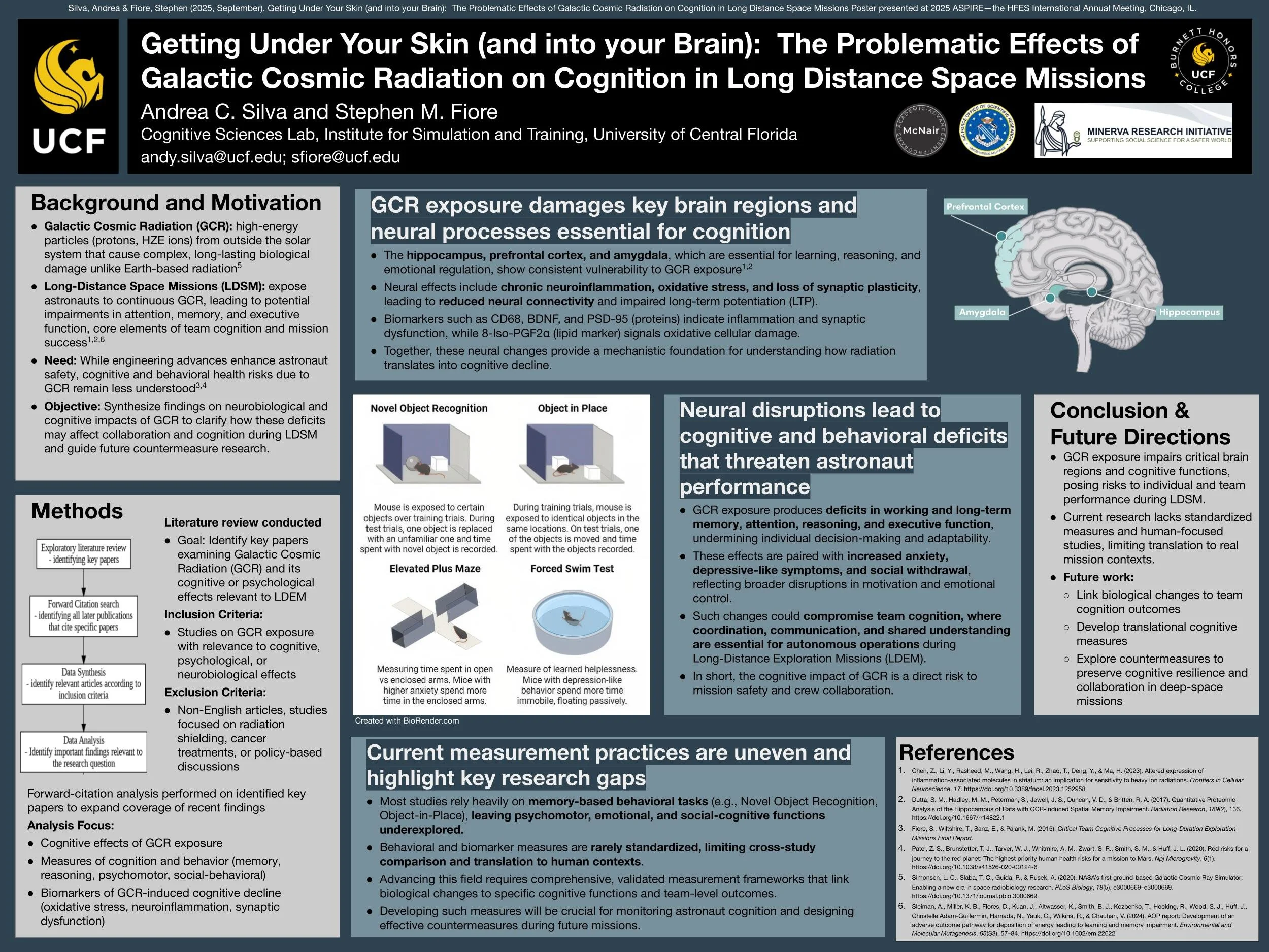 Silva, Andrea & Fiore, Stephen (2025, September). Getting Under Your Skin (and into your Brain): The Problematic Effects of Galactic Cosmic Radiation on Cognition in Long Distance Space Missions Poster presented at 2025 ASPIRE—the HFES International Annual Meeting, Chicago, IL.